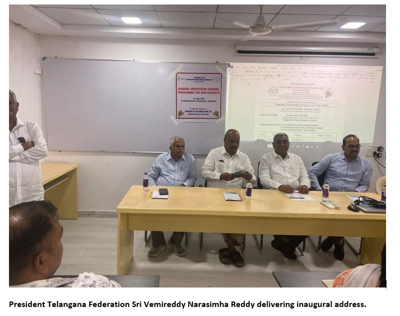 Sri Vemireddy Narasimha Reddy President of Telangana Federation presided the meeting and advised the participants to utilise the program for their improvement as most of the participants are less than 6 months old in the UCBs.